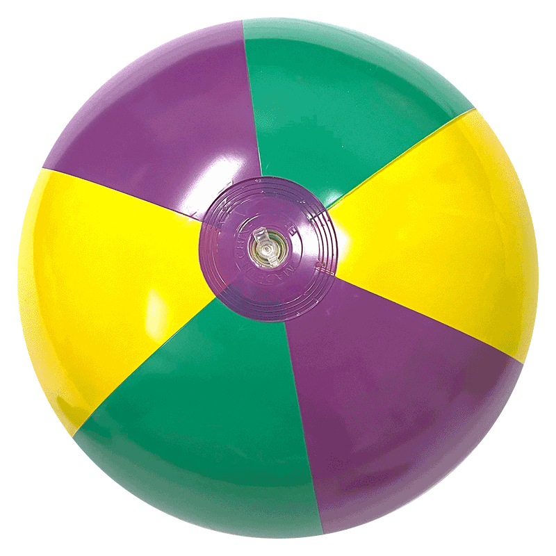 Perfect for the upcoming 2023 Mardi Gras and expected to be available soon. These are 20-Inch Deflated Size Green, Purple & Yellow alternating Beach Balls with Purple end circles. When fully inflated, these Mardi Gras Beach Balls stand about 15-Inches High or Diameter.