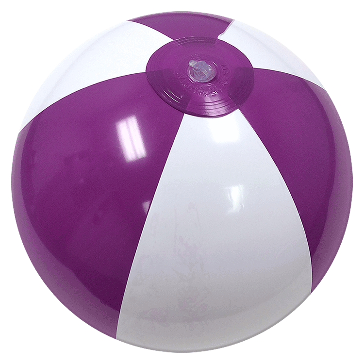 Purple and alternating White panel Beach Balls in 16-Inch Deflated Size. The end circles are Purple. These Beach Balls, when fully inflated, stand about 12-Inches high or diameter. Comes with a regular non-scratch safety valve for easier inflation.